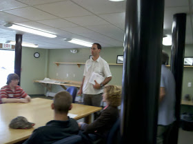 Pictured here: KMS Head of School Tao Smith addresses new families at Saturdays oreintation. Logan looks on.